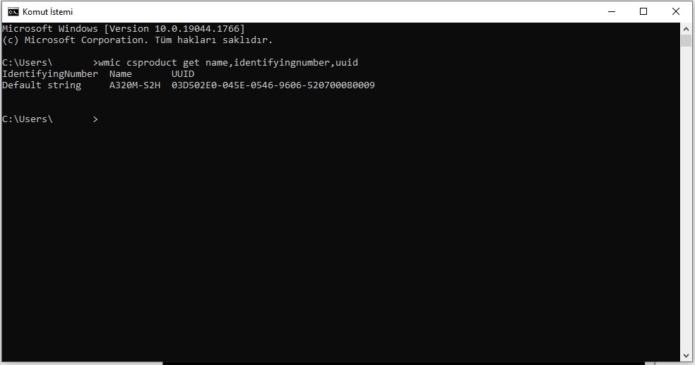 wmic csproduct get name,identifyingnumber,uuidkomutunu yazın. - Enter tuşuna basın.