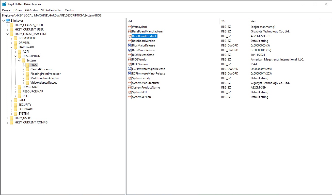 - Açılan sayfada HKEY_LOCAL_MACHİNE/ Hardware/ Description/ System/ Bios yollarını takip edin.
